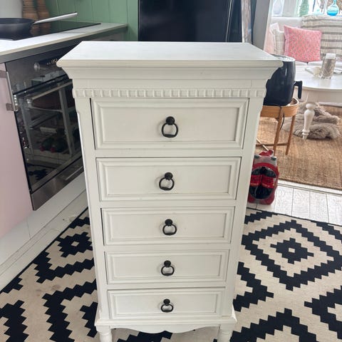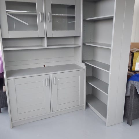 Flotte skap med hyller. Fine detaljer med litt slitt look. Ser ut som det er skuffer, men det er to skapdører og hyller bak.