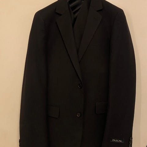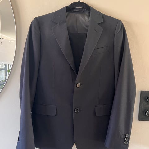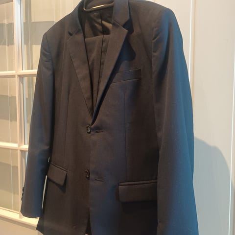 Pen svart dress som består av bukse og jakke. Fin, smal passform. Flott kvalitet.