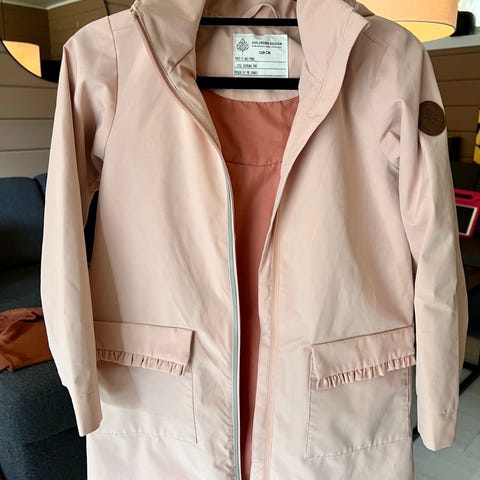 Selger regnkåpe i str. 128 fra Wheat, fin gammelrosa farge. Med oppbevaringspose i samme stoff og farge. Har misfarge på innsiden av kåpen, men ikke noen merker utenpå. Selges derfor billig.