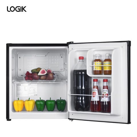 Mini kjøleskap i kompakt størrelse, svart utførelse. Skapet har bærehåndtak på toppen for enkel flytting og kan plasseres på bord eller gulv. Innvendig er det et åpent hovedrom med feste for eventuell hylle samt en liten dørhylle for mindre produkter. Strømkabel følger med. Egner seg til oppbevaring av drikke, snacks eller små matvarer på kontor, soverom, hybel eller hytte. Drives via strømtilkobling på baksiden.