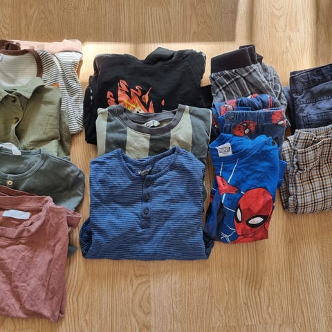 Klespakke med klær i str 116. Klærne er brukt i barnehage og kan ha små flekker/anmerkninger.