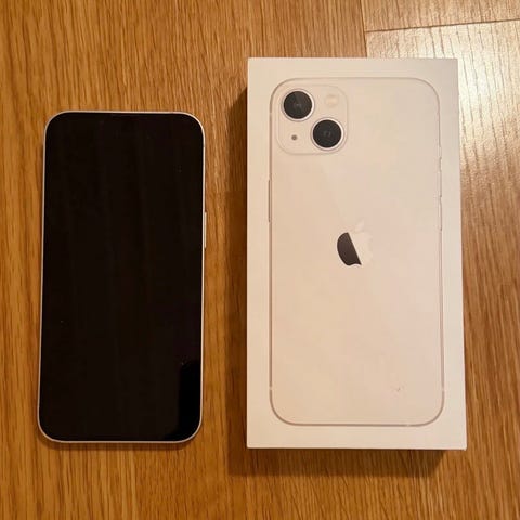 Meget pent brukt Apple iPhone 13, 256 GB lagringsplass i hvit farge og nylig byttet batteri. Følger med et transparent deksel og ledning (usb-c til lightning) og original eske.