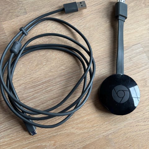 Google Chromecast med Google TV mediespiller i hvit farge med fjernkontroll. Enheten kobles til TV via HDMI-kontakt og får strøm via USB‑C-port. Mediespilleren er laget for å strømme innhold fra ulike tjenester og apper til TV-en. Egnet for bruk med TV-er eller skjermer som har ledig HDMI-inngang og tilgang til strøm via medfølgende eller kompatibel strømforsyning.