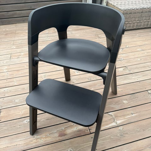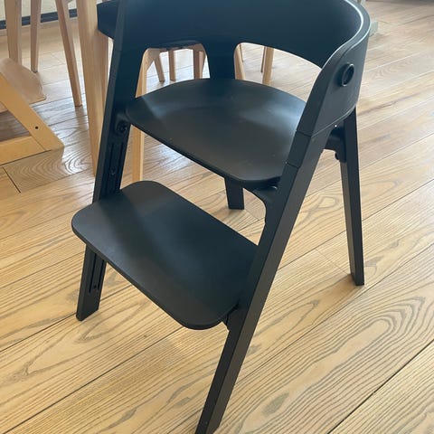 Stokke steps barnestol i svart. Stolen er brukt av to barn og er veldig grei med tanke på at den er vaskbar og god å sitte i.