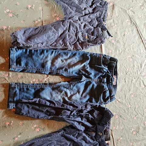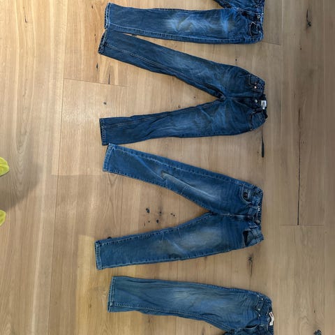 Selger en hvit skjorte med mønster fra Majoral. Jeans fra Lab Industries og Name it (liten rift på det ene låret). Bruksmerker kan forekomme.