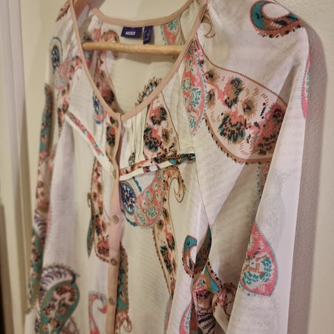 Denne skjorten er fra det nederlandske merket Mexx. Det er en langermet bluse med brunt bakteppe og et iøynefallende blomstermønster i rødt, oransje og kremhvitt. 70-tallsstil!