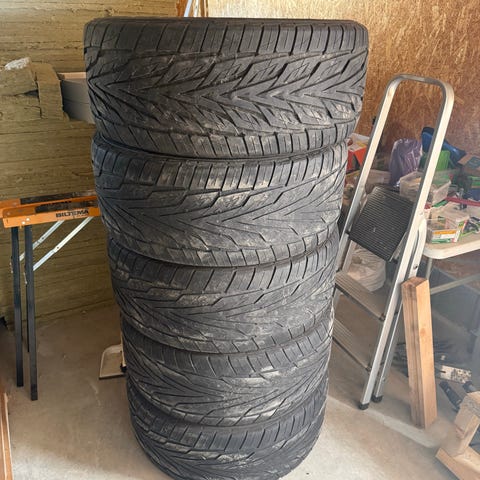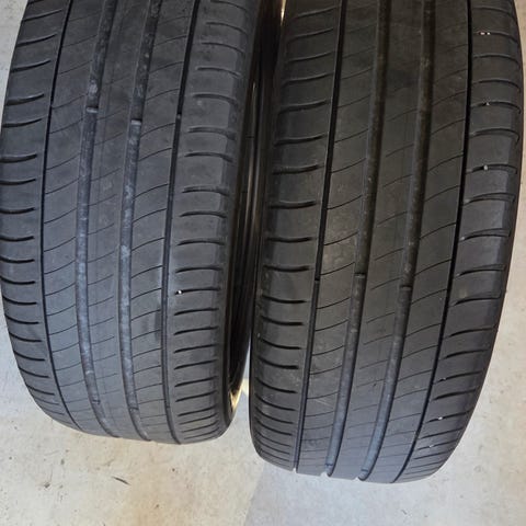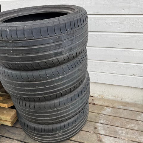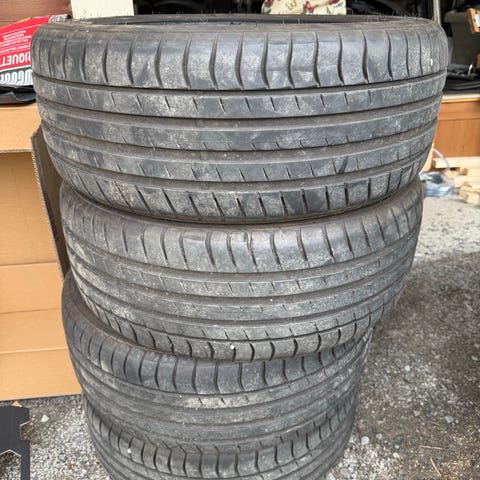 Dekkene er jevnt slitt og uten skader/plugger. Selges samlet