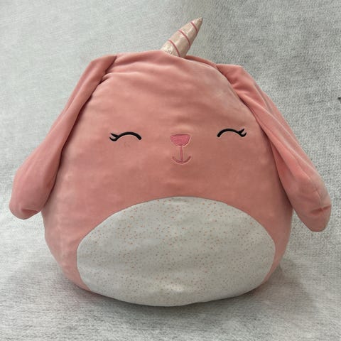 Populær og ettertraktet Squishmallows. En rosa figur som kombinerer enhjørning og kanin, med lange ører, hvit mage med mønster og et sølvfarget horn på toppen. Mykt plysjmateriale som egner seg som koseleke, samlerobjekt eller pyntepute. Passer for alle som liker myke kosedyr og fantasidyr som enhjørninger. Kun stått til pynt. Ca. 50 cm fra topp til bunn.