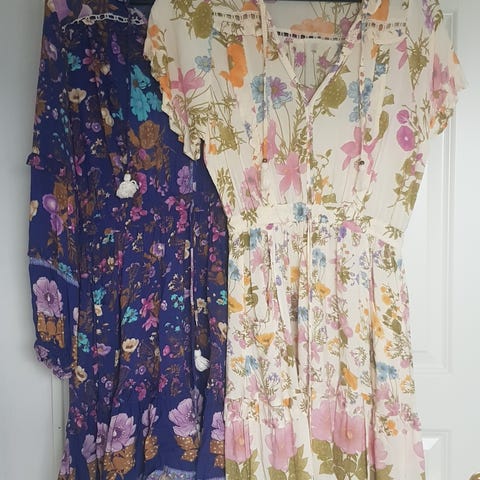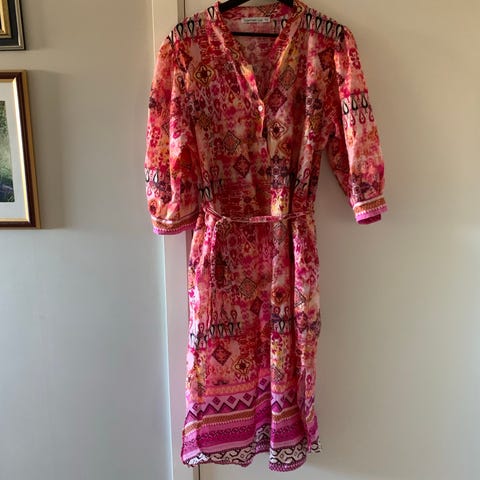 Sommerkjole i 100% bomull, flerfarget. Snøring i livet og korte ermer.