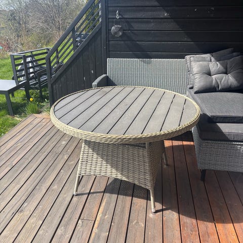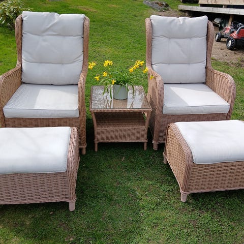 2 stk regulerbare stoler m/ puter og bord selges. Bord er noe skadet i kunstrottingen under glassplaten. Ingen skader på stolene. Møblene er lagret inne på vinter.