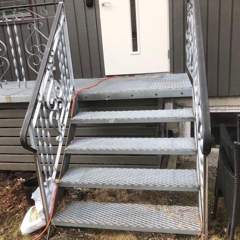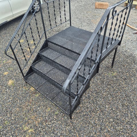Metalltrapp for utendørs bruk med trinn og repos i gitterrist. Trappen har sidevanger og rekkverk på én side, egnet som adkomsttrapp til terrasse, inngangsparti eller lignende. Konstruksjonen er i metall med åpne rister som gir god drenering for vann og snø.