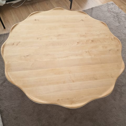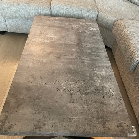 Sofabord med mulighet for hev og senk, samt mye oppbevaringsplass. Det er et merke/ødelagt område på siden av bordet. Må hentes.