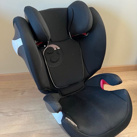 Cybex Solution X2-fix barnesete. Barnesetet er i hovedsak svart med enkelte kontrastdetaljer. Modellen har høy rygg og justerbar hodestøtte for bedre støtte til barnets hode og overkropp.