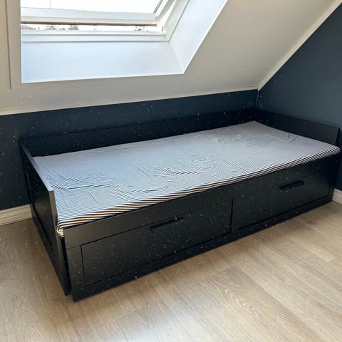 IKEA brimnes dagseng i svart utførelse. Sengen har rygg- og sidepaneler samt sengebunn med lameller i tre. Under sengen er det integrerte oppbevaringsskuffer som gir ekstra lagringsplass. Egner seg som enkeltseng eller dagseng i soverom, barnerom eller gjesterom. Selges uten madrasser. En av plankene er knekt (se bilde)