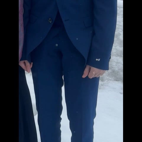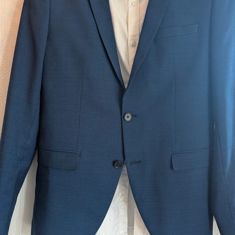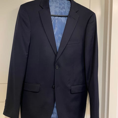 Blå dress selges. Innvendig Benmål, 77 cm. Stoff: 77% polyester og 22% ull. Skjorte følger med.