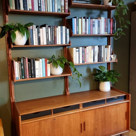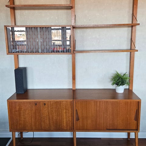 Veggen “De Luxe”-seksjonen er tegnet av Torbjørn Afdal og Rolf Hesland for Bruksbo Tegnekontor, og ble produsert ved Ringerike Møbel- og Trevarefabrikk på 1950- og 60-tallet.