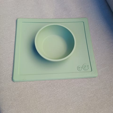 Stokke ezpz spisebrikke i grå silikon. Spisebrikken har integrerte skåler i to størrelser og er formet for å passe på et brett eller bordkant. Laget i myk, fleksibel silikon som ligger stødig på underlaget. Egnet til servering av mat til barn ved måltider og snacks.