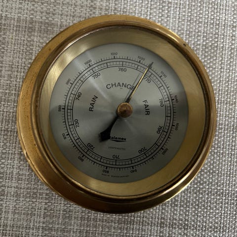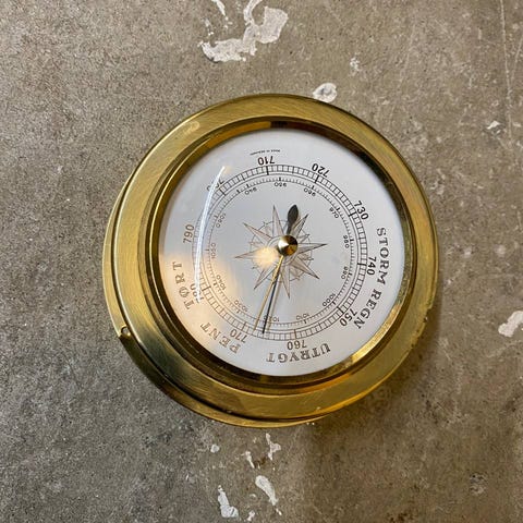 Hygro analog hygrometer i messing. Rund modell med hvit urskive og tydelig skala for relativ luftfuktighet i prosent. Instrumentet har markering for «Normal» område og er beregnet for vegg- eller panelmontering, for eksempel i båt, hytte eller innendørs rom der man ønsker å overvåke luftfuktigheten.