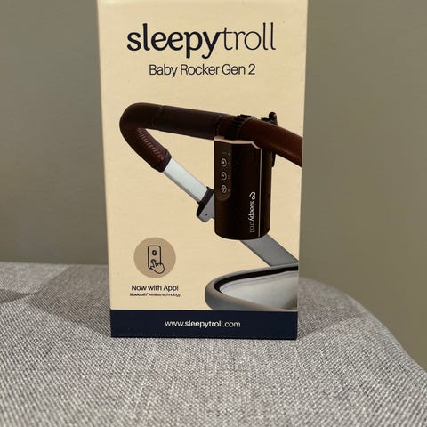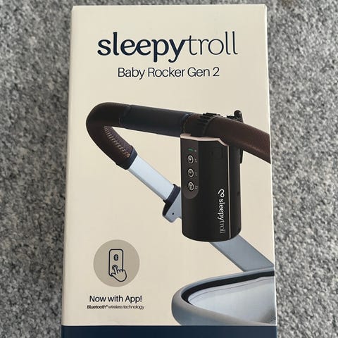 Førstegenerasjons sleepytroll vognvugger. Følger med spiralfjær for å montere under krybbe, samt brakett for å bruke til sprinkelseng.