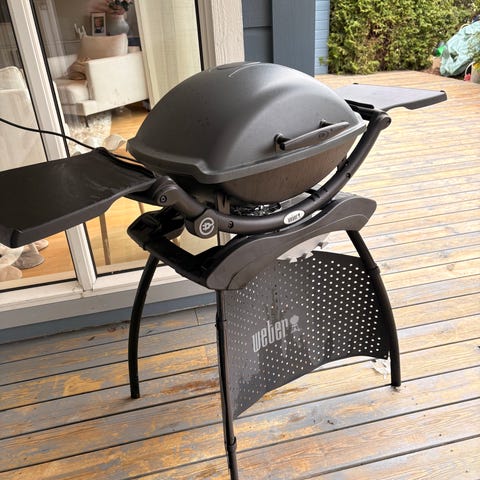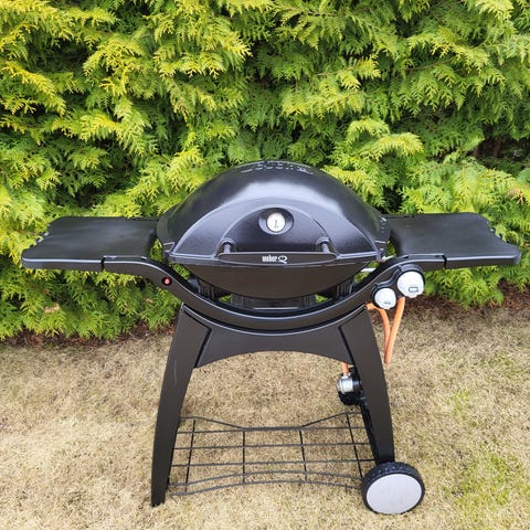 Grillen har lokk med innebygd termometer Grillrist i støpejern med to brennere, som gir jevn og fin varme