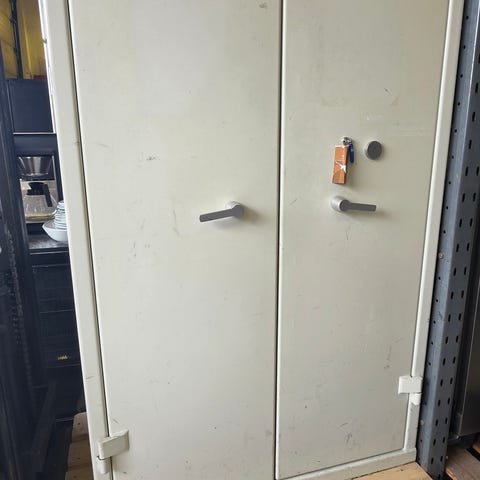 Duun SGS7 sikkerhetsskap i hvit utførelse. Skapet er et FG-godkjent sikkerhetsskap (FG-307/D1) produsert av Duun Industrier. Innvendig har skapet hyllesystem og festeanordninger til oppbevaring. Egnet for sikker oppbevaring av gjenstander i bolig, garasje eller andre rom der det er behov for låsbar og robust lagring. Leveres med nøkkellås på døren.må hentes.