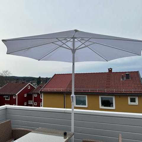 Må hentes i fjerde etasje: NB! Parasollfoten er veldig tung, så her trengs det flere mennesker eller en sterk person. Vi kan hjelpe til med å bære ned til bakkeplan.