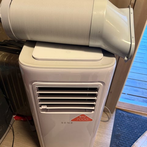 Mobil aircondition er egnet for midlertidig kjøling av mindre rom der fastmontert anlegg ikke er tilgjengelig. Apparatet har hjul for enklere forflytning mellom rom.