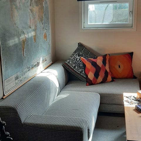 Sofaen er fint brukt, ingen skader bare noen nypper i stoffet noen steder, men jeg mener det skal være mulig å få tak i nye trekk til sofaen