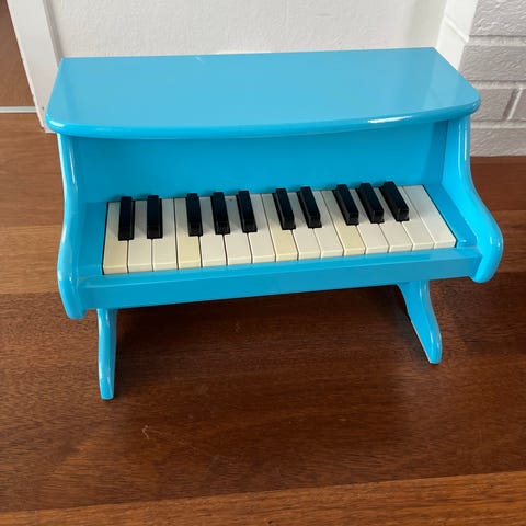 Kjekt lekepiano med ulike melodier, rytmer og lydknapper. Krakk medfølger.
