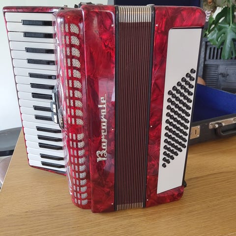 Gammelt og godt trekkspill i rød perlemor-finish. Instrumentet har pianotangenter på høyre side og knappesystem på venstre side. Passer til ulike musikkstiler og nivåer, fra øving hjemme til bruk i ensemble eller orkester. Egner seg for både nybegynnere og mer erfarne spillere som ønsker et klassisk pianotrekkspill med knappesystem på bassiden.