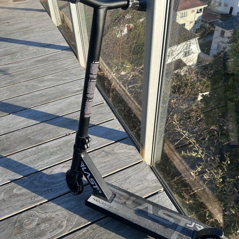 Madd Gear Blast Pro sparkesykkel i svart og grå farge. Modellen er godkjent etter EN14619 klasse A og har oppgitt maksimal brukervekt på 100 kg. Anbefalt alder fra 6 år og oppover. Styret har T-form med grep i plast/gummi, og brettet har trykket Blast-logo. Egner seg til bruk på asfalt og jevne underlag.
