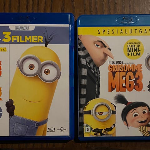 Illumination Minions Blu-ray film. Animasjonsfilm om Minions-figurene, utgitt på Blu-ray-format. Omslaget viser at utgaven inneholder tre nye mini-filmer. Egnet for avspilling på Blu-ray-spillere som støtter standard Blu-ray-plater. Passer for dem som ønsker filmen i fysisk format til samling eller hjemmekino.