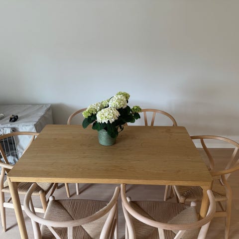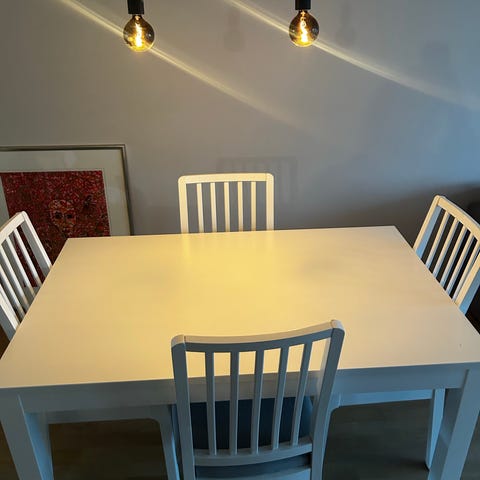 Selger lite brukt spisebord, plass til 4 eller 6 personer komfortabelt rundt bordet. Bordet kan forlenges da blir det plass til 6 personer, veldig enkelt a utvide.