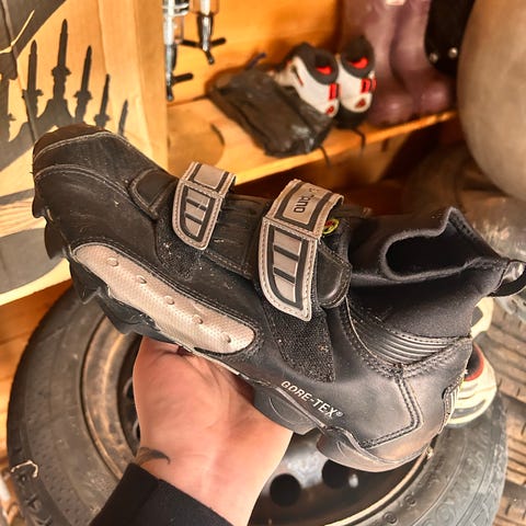 Sidi sykkelsko for terreng med SPD-kompatible klosser. Skoene er i størrelse 44 og har overdel i syntetisk materiale i svart med røde detaljer. Lukkes med tre borrelåsstropper for justerbar passform. Sålen har knotter for grep ved gåing og feste for klosser til klikkpedaler. Egnet til terrengsykling og bruk med kompatible pedaler.