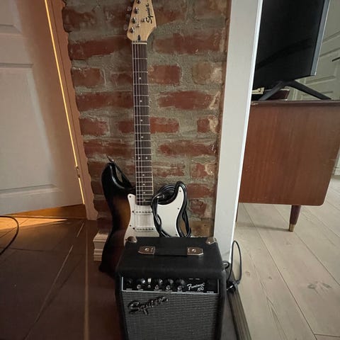 Settet inkluderer elektrisk gitar, Marshall Valvestate VS100 gitarforsterker, fotbryter og instrumentkabel etter det som vises på bildene.