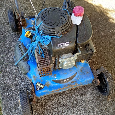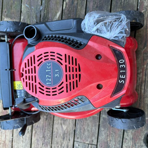 Plastdeksel som beskytter reimer for drift av klippeblad og hjul er dessverre ødelagt/sprukket. Derfor pakkes det gress rundt drivhjul som fører til at reimer hopper av. Motor starter og går.