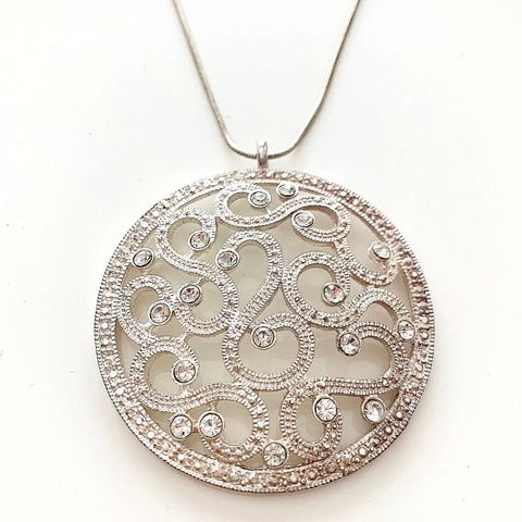 Accessorize smykke i stål med rundt anheng dekorert med krystall, til dame. Anhenget har et detaljert mønster på forsiden og en strukturert bakside. Kjedet er i stål med forlengelseskjede og karabinlås for justerbar lengde. Egner seg som hverdags- eller tilbehørssmykke til ulike antrekk. Kjedet er ca 86 cm langt.
