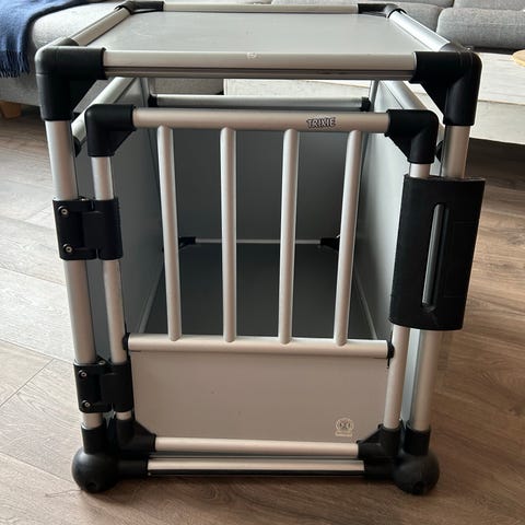 Hundebur utformet som et møbel i eik. Buret har åpning i front og sprosser på sidene som gir god lufting og innsyn. Flat topp kan brukes som bordplate eller avlastningsflate. Passer til mellomstore hunder. Egnet som liggeplass og hvileplass innendørs. Madrass eller pute kan legges i bunnen for økt komfort (ikke inkludert i salget). Buret har ikke dør, da vi tok bort denne.