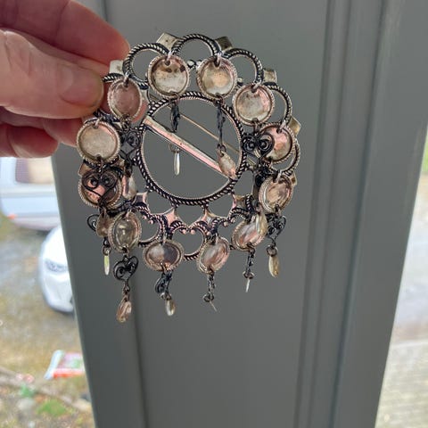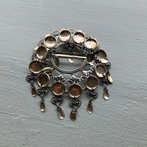 Sylvsmidja sølje i sølv for dame. Søljen har tradisjonelt filigransarbeid med flere hengende løv og ringer i sølv. Den festes med nål på baksiden og kan brukes til bunad eller andre høytidelige anledninger der sølv tilbehør er ønsket.