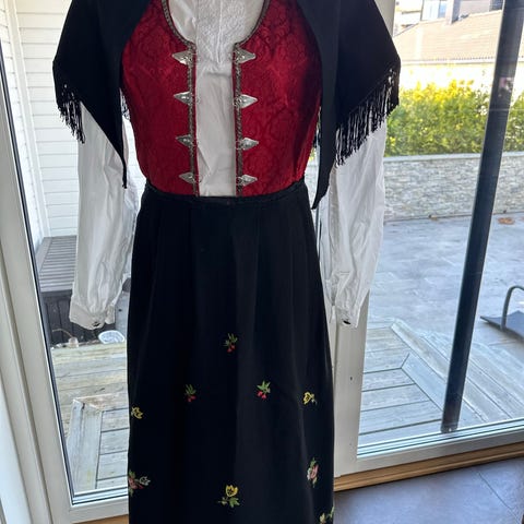 Selger med tungt hjerte min nydelige bunad da den ikke blir brukt, og den er for fin til å bare henge i skapet. Selges som på bildene med sølv fra Sylvsmidja som på bildet (har ikke de knappene til halsen på skjorta da jeg har brukt arvesølje der). Ubrukt paraply med matchende farge og mønster følger med om ønskelig.