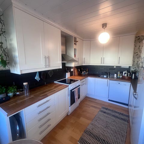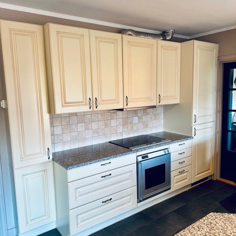 Hvit kjøkkeninnredning med overskap, underskap, høyskap og skuffer. Innredningen har profilerte fronter og benkeplate i lys utførelse. Kjøkkenet inkluderer integrert stekeovn, platetopp, ventilator og mikrobølgeovn, samt vaskesone med kum og blandebatteri. Løsningen er utformet som et vinkelkjøkken med god benkeplass og oppbevaringsmuligheter i både skap og skuffer. Passer til montering i tilsvarende romløsning som på bildene, eller kan tilpasses andre kjøkkenrom etter behov.
