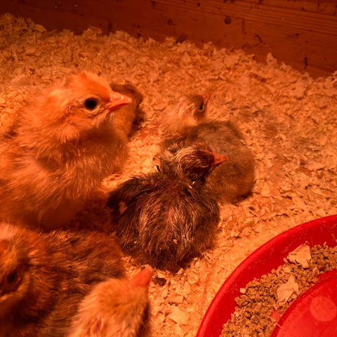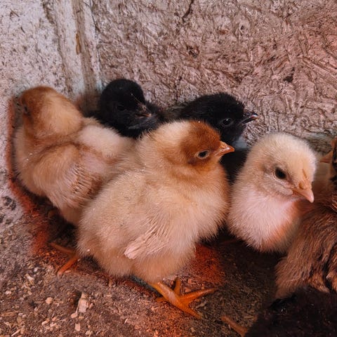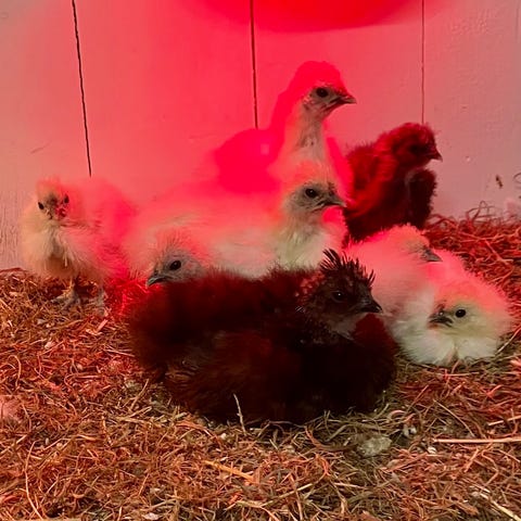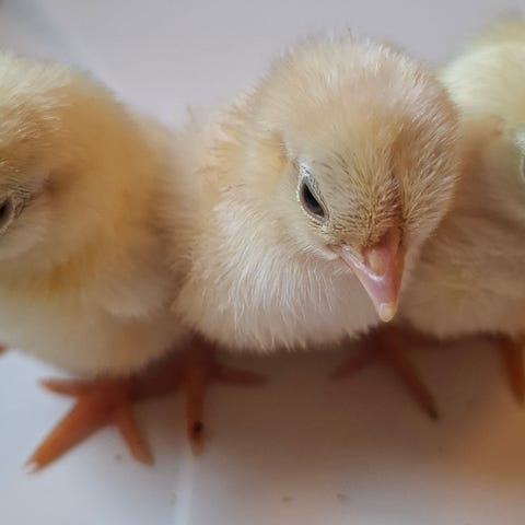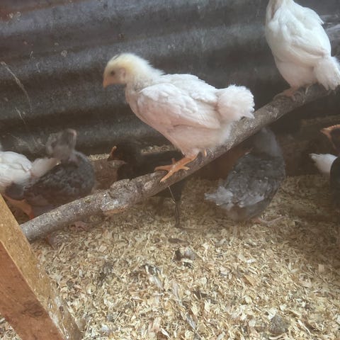 Lys sussex kyllinger. Rasetypiske kyllinger som på sikt utvikler seg til store, tunge høns med hvit fjærdrakt og mørke tegninger rundt hals og hale. Egner seg som hobbyhøns i hage eller på småbruk. Det anbefales egnet bur eller hønsehus med tilgang til uteområde, samt varmelampe og riktig fôr i kyllingperioden.