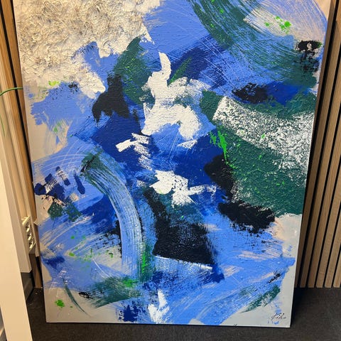 Abstrakt maleri på lerret i hovedsakelig blå og hvit fargeskala, med innslag av røde og oransje felt. Bildet har et moderne, non-figurativt uttrykk med tydelige penselstrøk og kontrastfarger. Passer som veggdekor i stue, gang, kontor eller andre oppholdsrom. Monteres på vegg ved hjelp av egnet oppheng etter ønske.
