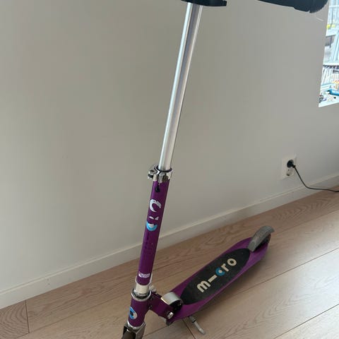 Pent brukt Micro sprite sparkesykkel til barn, lilla farge, m/justerbart styre og utfoldbar støtte.