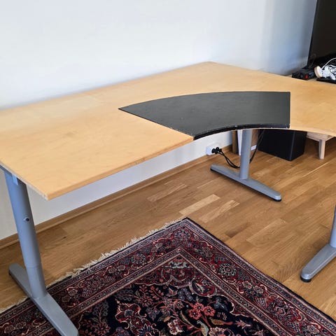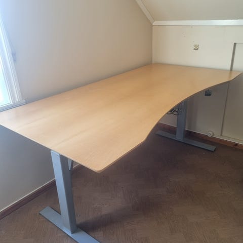 Stor, solid og pent brukt skrivebord/kontorpult fra Kinnarps med tykk bordplate og ergonomisk magebue. Har integrert kabelluke og kabelkurv. Grå T-bein og treplate. Det er ikke elektrisk hev/senk, men høyden (for sittende arbeidsstilling) kan enkelt justeres opp og ned manuelt og er i øyeblikket innstilt på 75 cm. Perfekt for hjemmekontor. Noen mindre bruksmerker, men generelt i god stand.