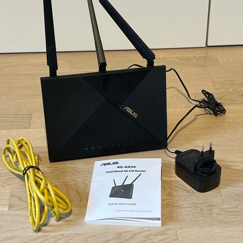 Asus 4G‑AC68U ruter med støtte for 4G LTE. Modellen er en dual band trådløs ruter som kan bruke mobildata via 4G. Enheten har flere LAN‑porter på baksiden for kablede tilkoblinger, samt WAN/LTE‑tilkobling. Ruteren leveres i svart farge og har eksterne antenner for trådløst signal. Strømadapter følger med, slik det vises på bildene. Egner seg til bruk som hjemmeruter eller for mindre kontormiljøer der man ønsker nettverk via 4G LTE.