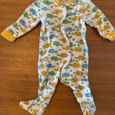Ukjent merke fleece pysjamas for baby i størrelse 56. Heldress med lange ermer og føtter, laget i myk fleece i beige farge med dyremønster. Glidelås foran for enkel av- og påkledning. Unisex-modell som passer både gutt og jente, egnet som nattdrakt eller kosedress inne.