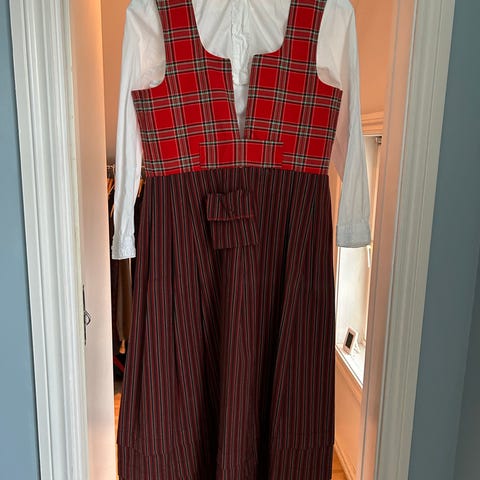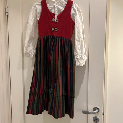 Flott bunad i klare rene farger. Komplett bunad med original skjorte med nupereller og hel drakt. Flere folder i skjørtet som kan sys ned slik at bunaden kan brukes i mange år.