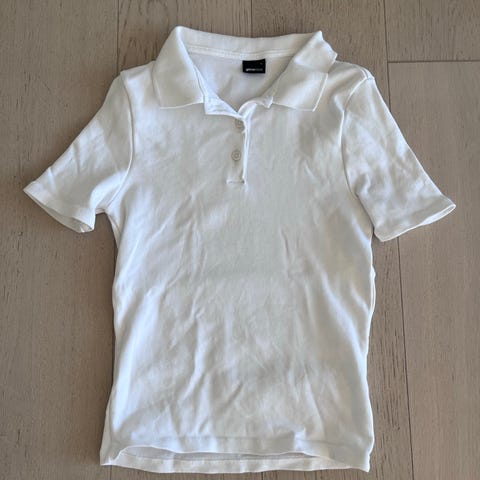 Gina Tricot T-skjorte for dame i størrelse L. T-skjorten er hvit og laget av 100 % bomull. Modellen har kort, litt vid passform med korte ermer og rund hals. Passer til hverdagsbruk alene eller under andre plagg.