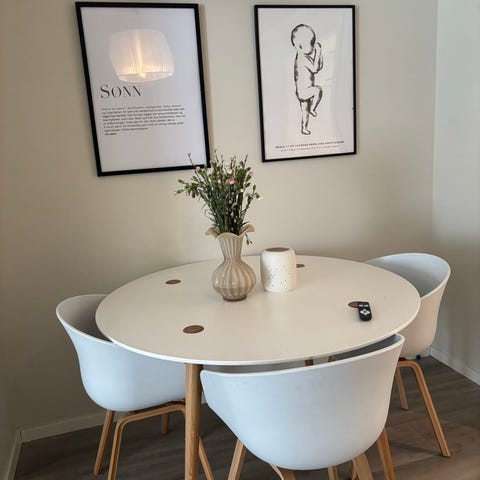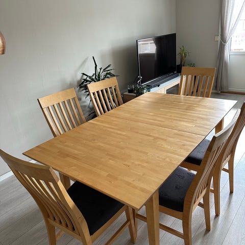 Spisegruppe selges med stoler er 1,90cm lang , følger med en plate for forlengelse. Selges grunnet flytting